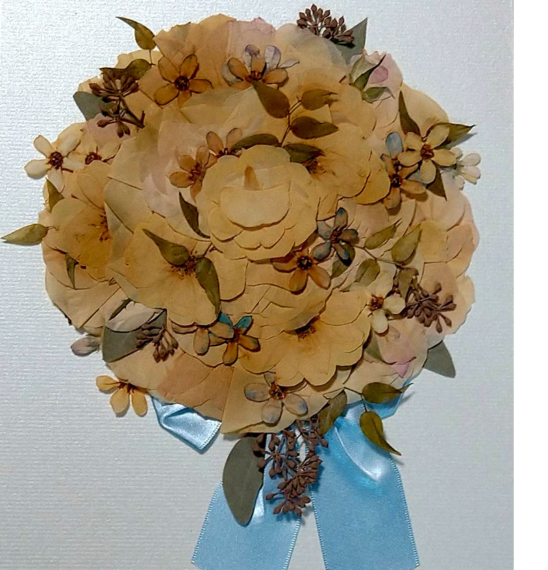 - プリザーブドフラワーのブーケは押し花には加工できません。ドライフラワーを選択されるか、プリザーブドフラワーを省いたレイアウトをお勧めいたします。